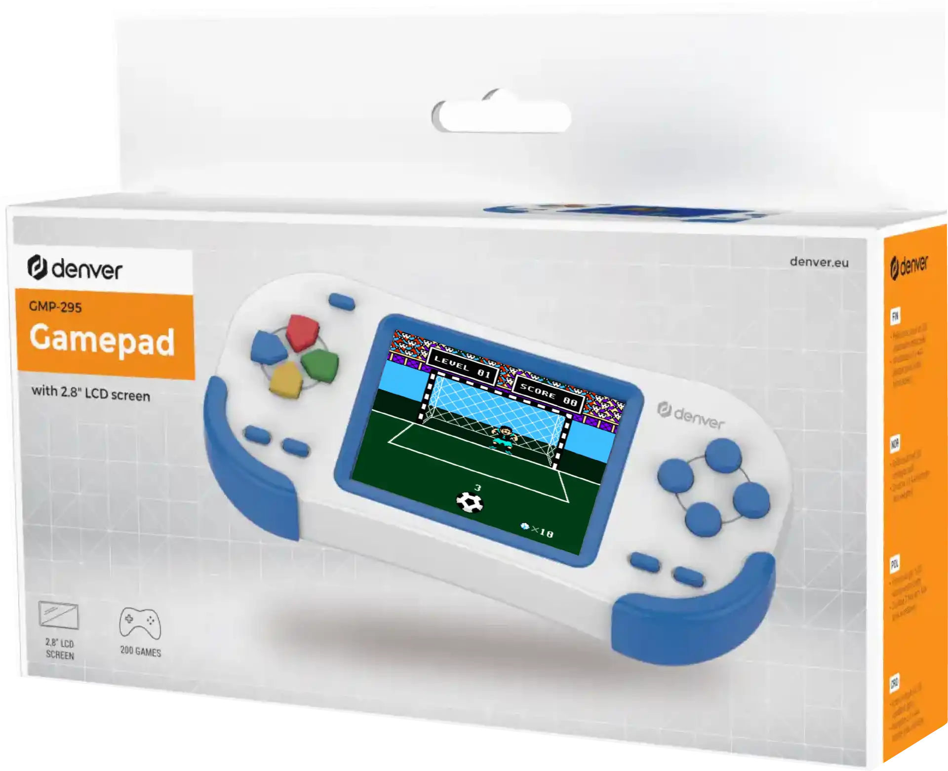 Denver GMP-295. Color del producto: Blanco, Tecnología de control para juegos: Analógico, Botones de función control para gaming: Cruceta. Pantalla: LCD, Diagonal de la pantalla: 7,11 cm (2.8"), Resolución de la pantalla: 320 x 240 Pixeles. Alimentación: Batería, Tipo de batería: AAA, Tecnología de batería: Alcalino. Ancho: 161 mm, Profundidad: 74 mm, Altura: 25 mm. Ancho del paquete: 191 mm, Profundidad del paquete: 74 mm, Altura del paquete: 25 mm
