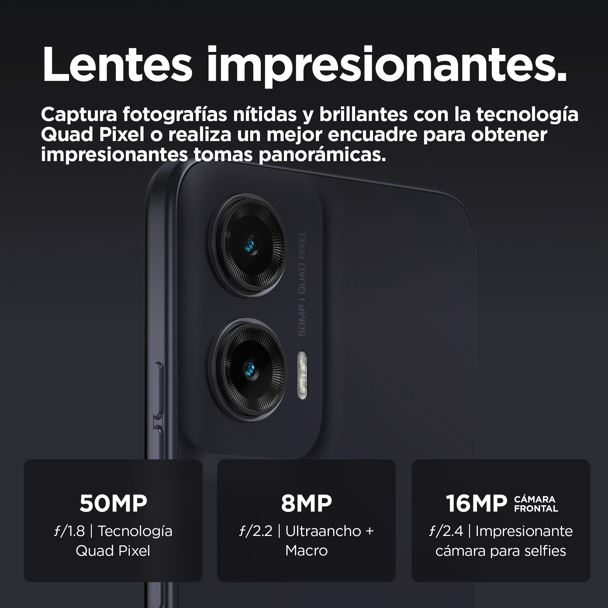 Motorola moto G35 5G. Diagonal de la pantalla: 17,1 cm (6.72"), Resolución de la pantalla: 2400 x 1080 Pixeles. Familia de procesador: Unisoc, Modelo del procesador: T760. Capacidad de RAM: 8 GB, Capacidad de almacenamiento interno: 256 GB. Resolución de la cámara trasera (numérica): 50 MP, Tipo de cámara trasera: Cámara doble. Capacidad de la tarjeta SIM: SIM doble. Sistema operativo instalado: Android 14. Capacidad de batería: 5000 mAh. Color del producto: Negro. Peso: 188 g